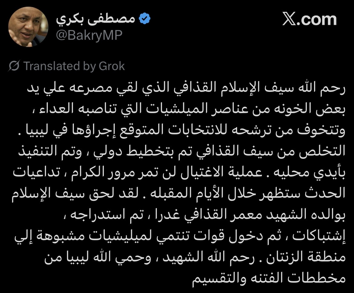 وكتب مصطفى بكري عبر حسابه على إكس: “رحم الله سيف الإسلام القذافي الذي لقي مصرعه على يد بعض الخونة من عناصر الميلشيات التي تناصبه العداء، وتتخوف من ترشحه للانتخابات المُتوقع إجراؤها في ليبيا”.