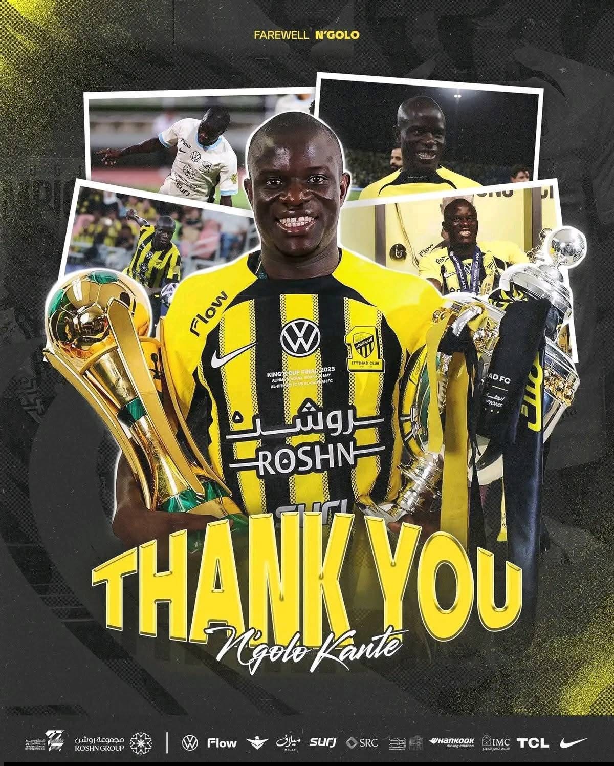 وأعلنت الصفحة الرسمية للاتحاد السعودي، رحيل الفرنسي نغولو كانتي، وعلقت عبر فيسبوك: شكرًا لك.