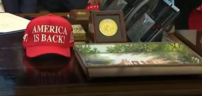 وُضعت القبعة، التي تحمل عبارة "أمريكا عادت!"، على المكتب البيضاوي خلال مراسم التوقيع، حيث أشاد رئيس مجلس النواب الأمريكي مايك جونسون بالشعار وهو يقف بجانب الرئيس، بحسب ما أفادت به شبكة فوكس نيوز.
