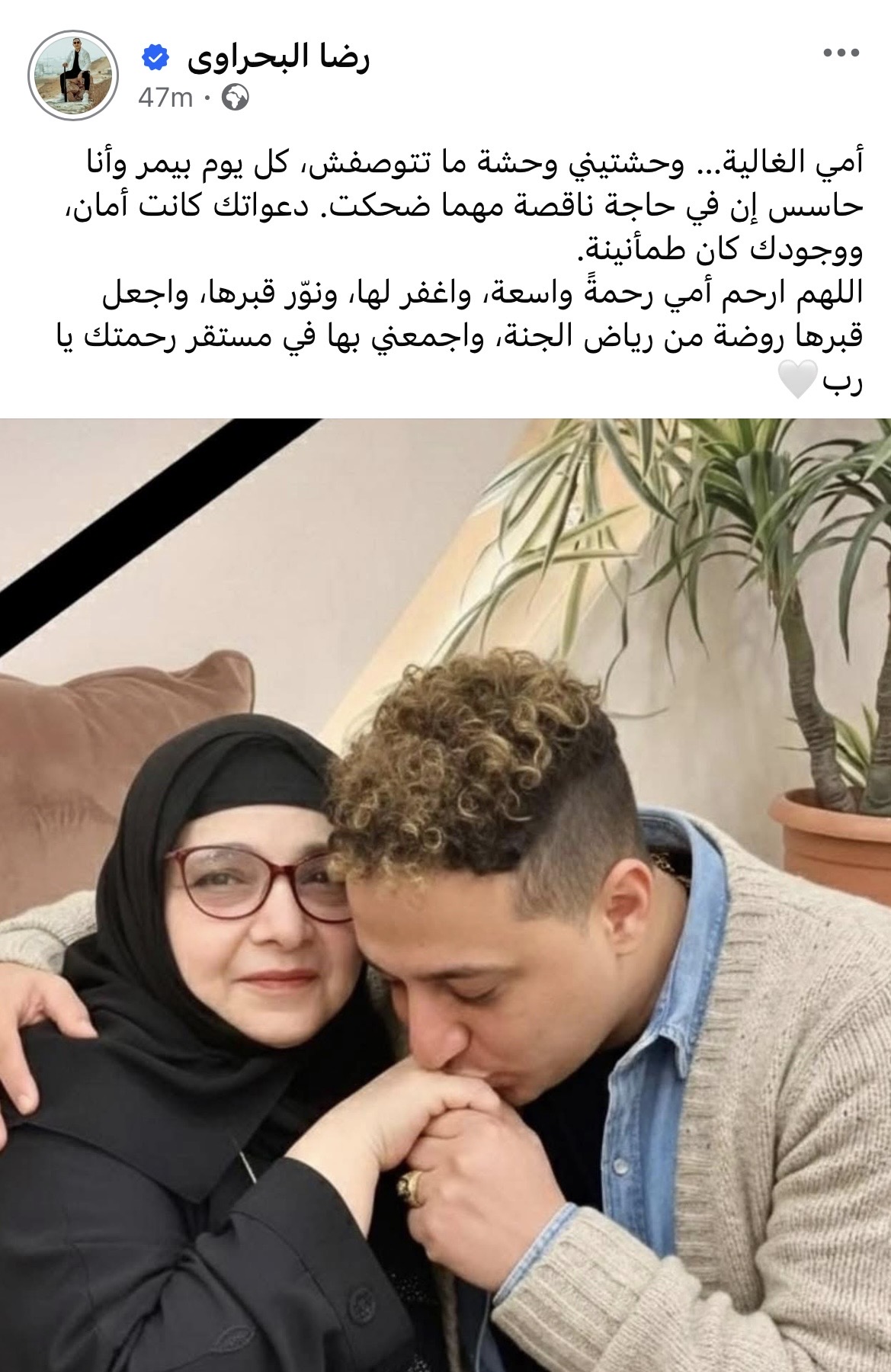 وكتب البحراوي عبر فيسبوك: “أمي الغالية… وحشتيني وحشة ما تتوصفش، كل يوم بيمر وأنا حاسس إن في حاجة ناقصة مهما ضحكت. دعواتك كانت أمان، ووجودك كان طمأنينة. اللهم ارحم أمي رحمةً واسعة، واغفر لها، ونوّر قبرها، واجعل قبرها روضة من رياض الجنة، واجمعني بها في مستقر رحمتك يا رب”.