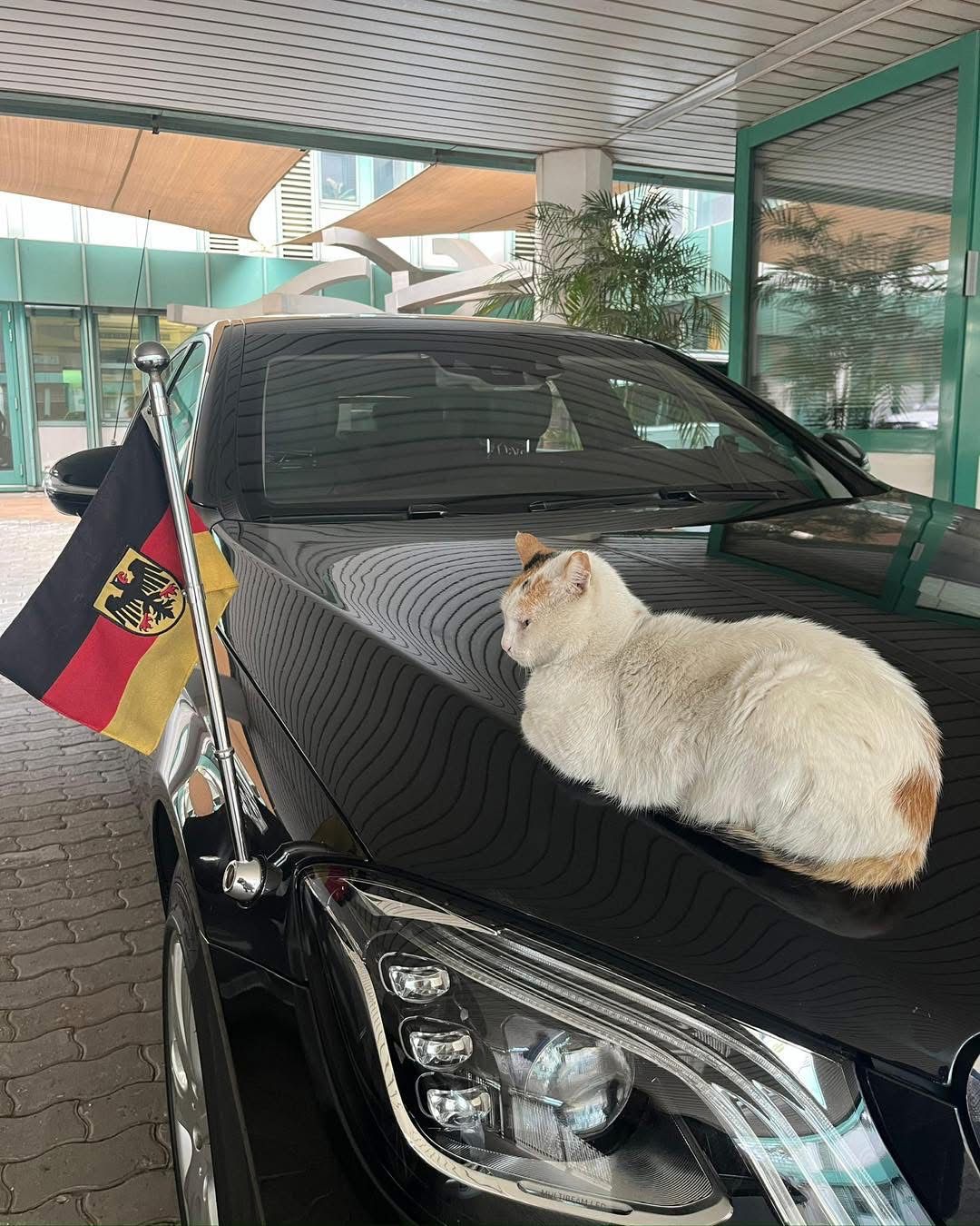نشر الحساب الرسمي للسفارة الألمانية على كافة منصات التواصل الاجتماعي صورة طريفة، لقطة قررت تستلقي على سيارة السفير الألماني بالقاهرة.