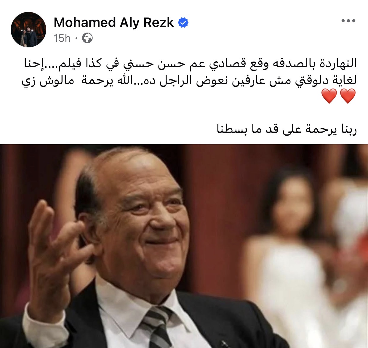 وكتب محمد رزق عبر حسابه الشخصي بموقع فيسبوك: “النهاردة بالصدفه وقع قصادي عم حسن حسني في كذا فيلم.... إحنا لغاية دلوقتي مش عارفين نعوض الراجل ده... اللّٰه يرحمة مالوش زي..ربنا يرحمة على قد ما بسطنا”.