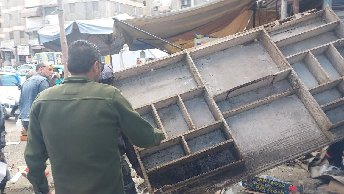 وقد أسفرت جهود الحملة عن إزالة فروشات للخضار والفاكهة وأقفاص خشبية وأقفاص بلاستيكية وعربات يد وشماسي وتند وبنوك خشبية وأكشاك وحواجز حجرية تعوق حركة المشاة والمركبات من أمام نهر الطريق مستخدمين معدات وسيارات الحى .