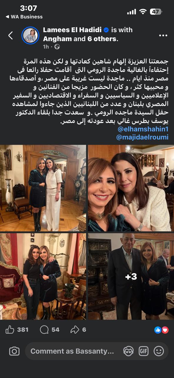 وكتبت لميس عبر صفحتها على موقع التواصل الاجتماعي فيسبوك:"جمعتنا العزيزة إلهام شاهين كعادتها و لكن هذه المرة إحتفاء بالغالية ماجدة الرومي التى أقامت حفلا رائعا فى مصر منذ ايام .. ماجدة ليست غريبة على مصر ،و أصدقاءها و محبيها كثر ، و كان الحضور مزيجا من الفنانين و الإعلاميين و السياسيين و السفراء و الاقتصاديين و السفير المصري بلبنان و عدد من اللبنانيين الذين جاءوا لمشاهده حفل السيدة ماجده الرومي .و سعدت جدا بلقاء الدكتور يوسف بطرس غالي بعد عودته إلى مصر".