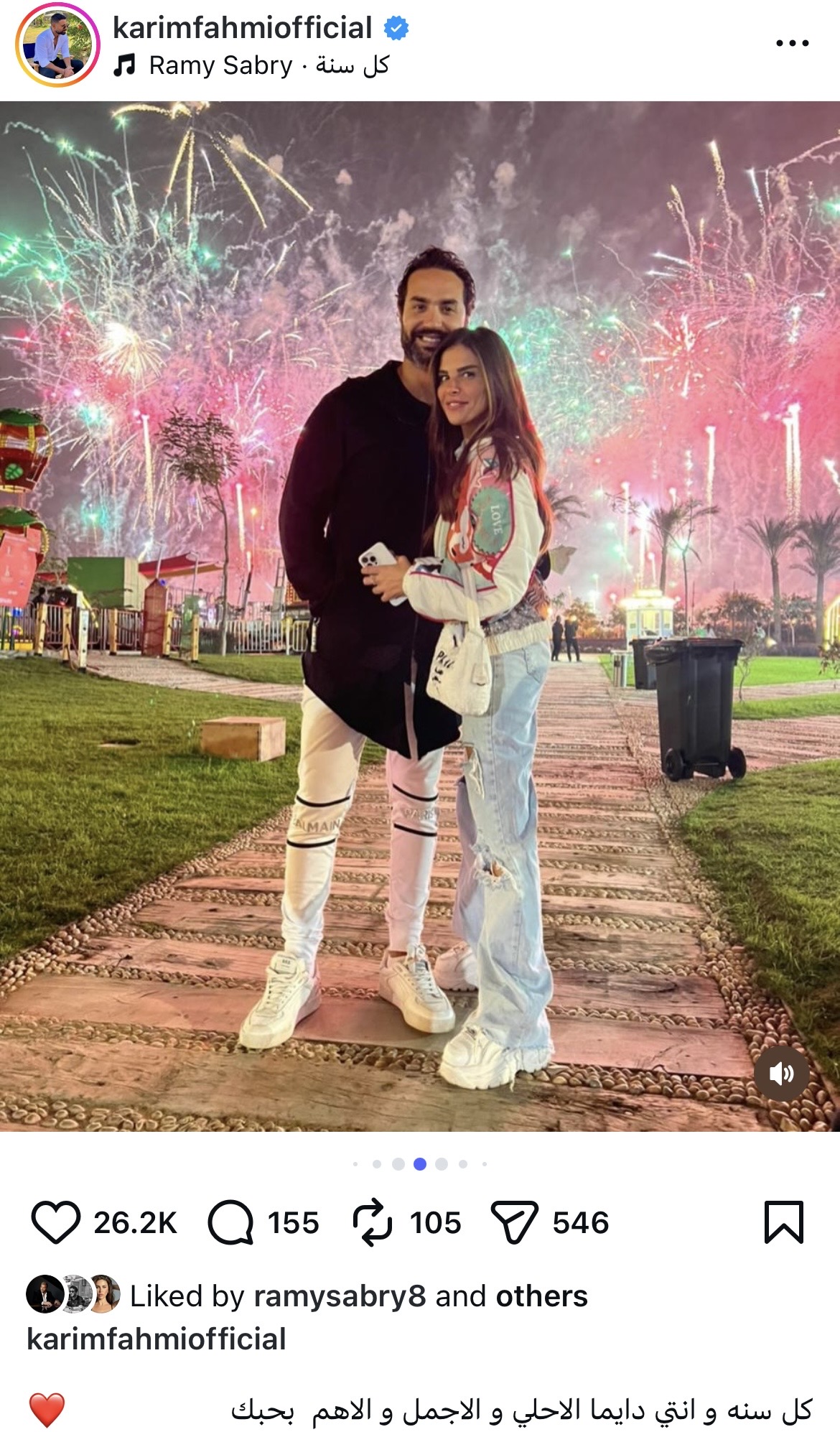 وكتب كريم فهمي، في رسالة رومانسية لزوجته: “كل سنة وإنتي دايما الأحلى والأجمل والأهم بحبك”.