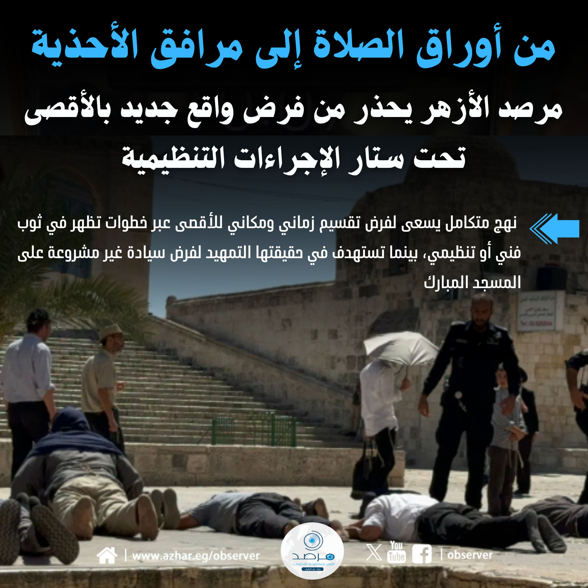 حذر مرصد الأزهر العالمي لمكافحة التطرف من فرض واقع جديد بالأقصى تحت ستار الإجراءات التنظيمية، بعد التصديق من قبل الاحتلال على وضع مرفق منظم لأحذية المستوطنين المقتحمين لباحات المسجد الأقصى المبارك عند بواباته.