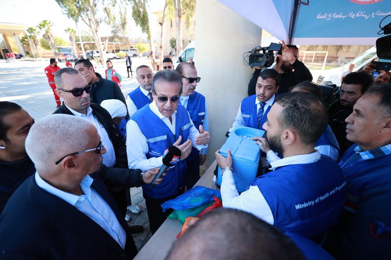 استقبل الوزير والمحافظ عدداً من المصابين والجرحى الوافدين من غزة، وتفقد نقطة الحجر الصحي بالمعبر، حيث اطمأن على توافر مخزون استراتيجي كافٍ من الأدوية والتطعيمات، ووجود 40 طبيباً، إلى جانب تمركز 60 سيارة إسعاف موزعة بشكل استراتيجي، وعيادات متنقلة، ونقطة رعاية حرجة، وفرق طبية متخصصة، وسيارة أشعة متطورة.