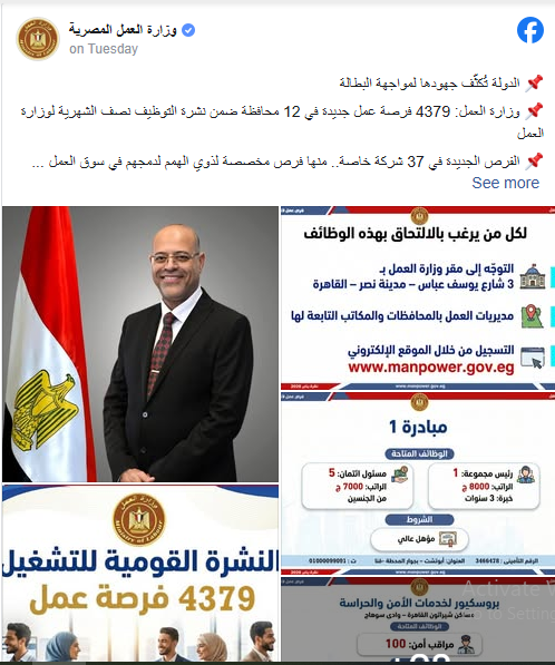 يبحث قطاع عريض من الشباب، عن فرص عمل جديدة من وزارة العمل، حيث أصدرت وزارة العمل، عبر صفحتها الرسمية بموقع فيس بوك، نشرة التوظيف نصف الشهرية متضمنة 4379 فرصة عمل جديدة في37 شركة خاصة داخل 12 محافظة من محافظات الجمهورية.