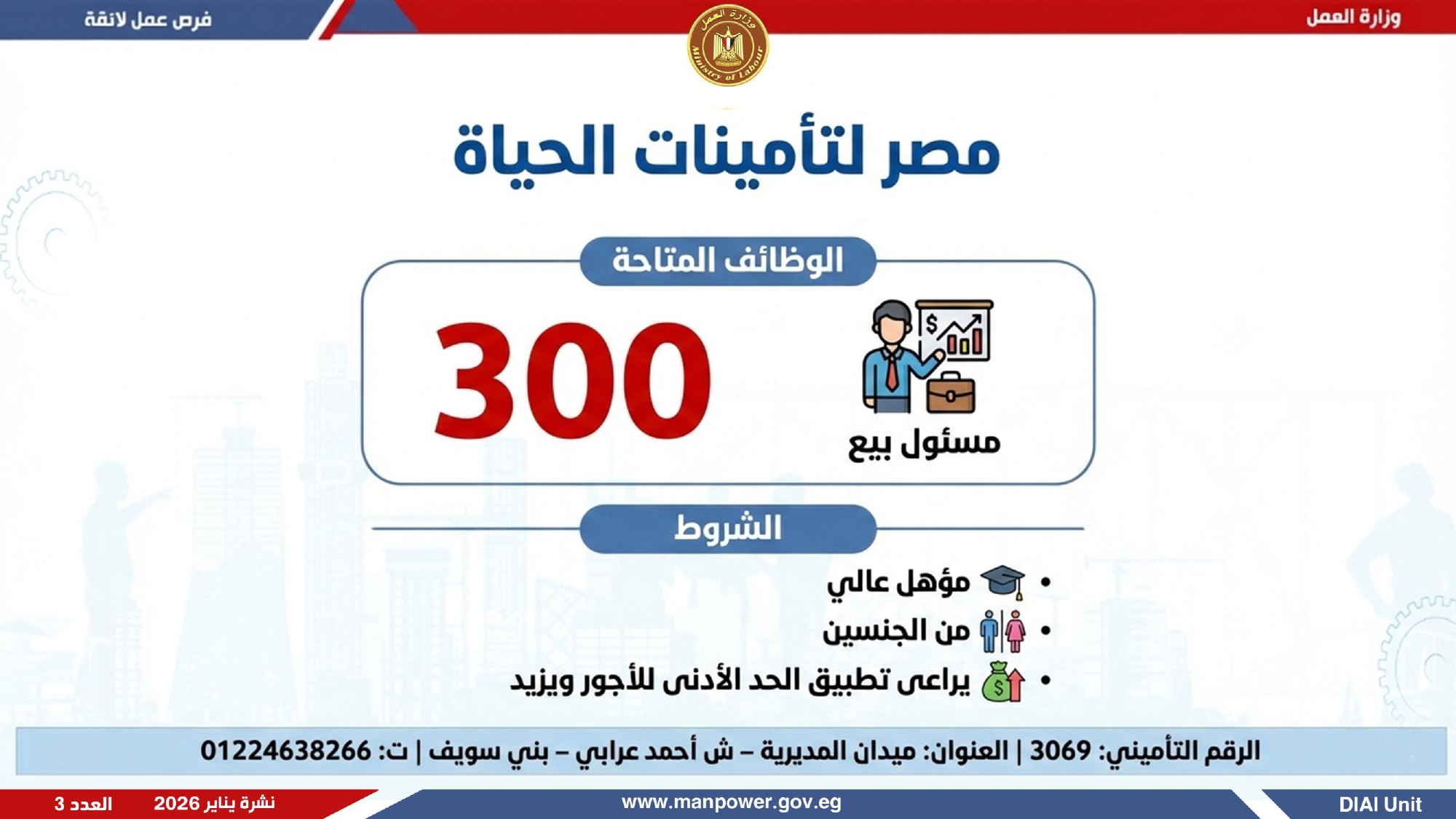 تغطي نشرة التوظيف نصف الشهرية الصادرة من وزارة العمل، فرص عمل بمحافظات: «القاهرة، القليوبية، الإسكندرية، الغربية، الإسماعيلية، المنيا، سوهاج، بني سويف، والمنوفية، قنا، ودمياط والفيوم»، ويستطيع قاطني هذه المحافظات التقديم على الوظائف المعلنة.