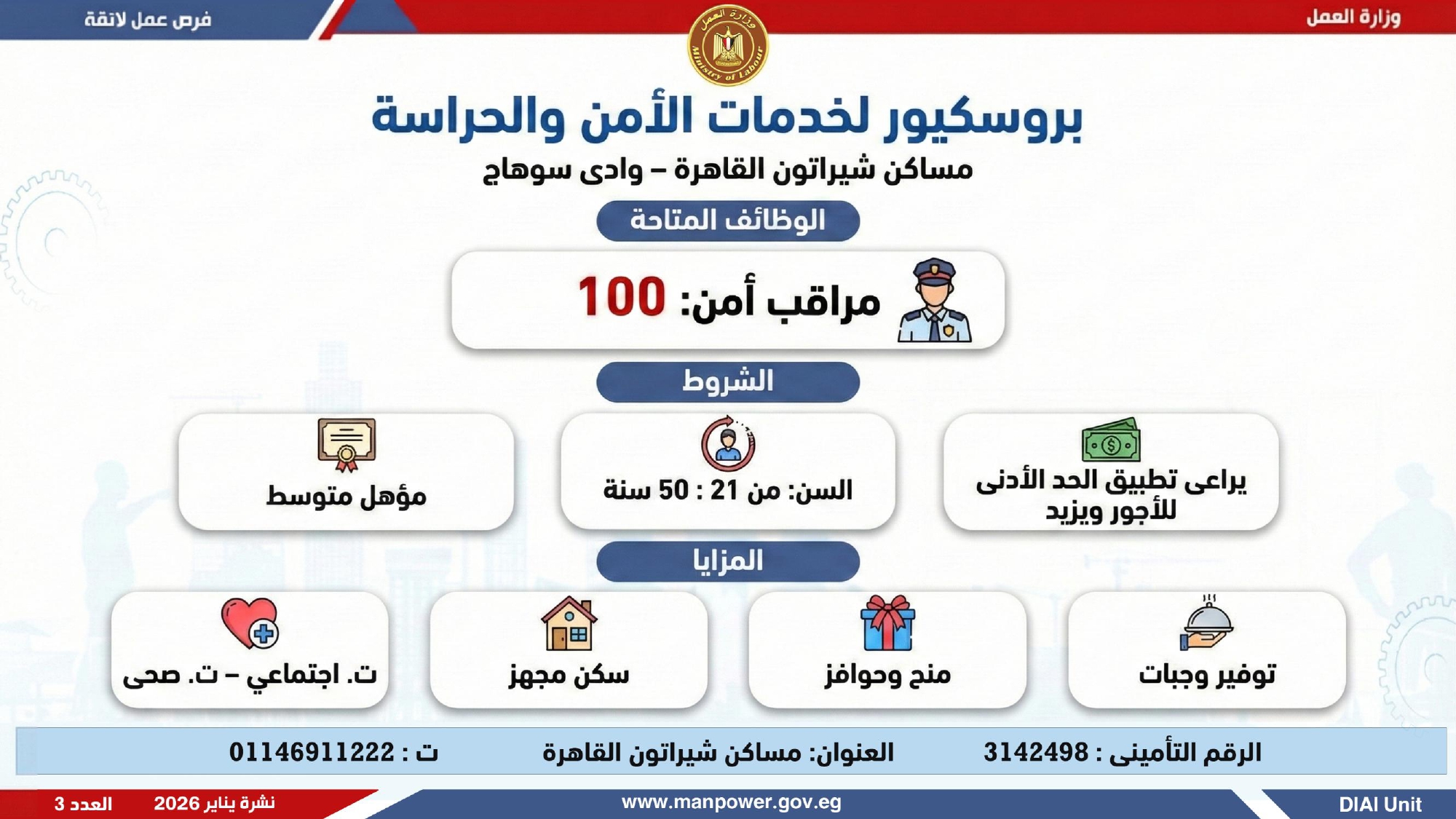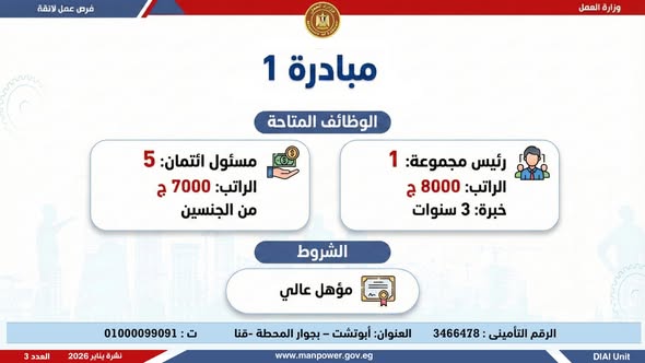 وأكدت الوزارة أن النشرة تتضمن عددًا من الوظائف المخصصة لذوي الهمم، تنفيذًا لأحكام القانون رقم 10 لسنة 2018 بشأن حقوق الأشخاص ذوي الإعاقة، والذي يُلزم المنشآت بتخصيص نسبة 5% من إجمالي العاملين بها لهذه الفئة، وذلك في إطار خطة الوزارة لحصر وتدريب وتشغيل ذوي الهمم ودمجهم في سوق العمل، تنفيذًا لتوجيهات فخامة الرئيس عبدالفتاح السيسي، رئيس الجمهورية، بتمكينهم اقتصاديًا ومجتمعيًا، وتحقيق دمج كامل ومستدام لهم في سوق العمل.