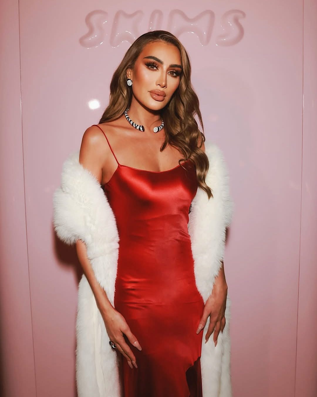 واعتمدت مايا على قصة فستان انسيابية بحمالات رفيعة، ونسّقته مع فرو أبيض أضفى لمسة فخامة ورقي على الإطلالة.