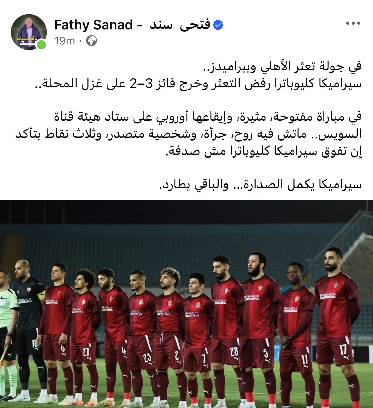 وتابع: “في مباراة مفتوحة، مثيرة، وإيقاعها أوروبي على ستاد هيئة قناة السويس.. ماتش فيه روح، جرأة، وشخصية متصدر، وثلاث نقاط بتأكد إن تفوق سيراميكا كليوباترا مش صدفة”.