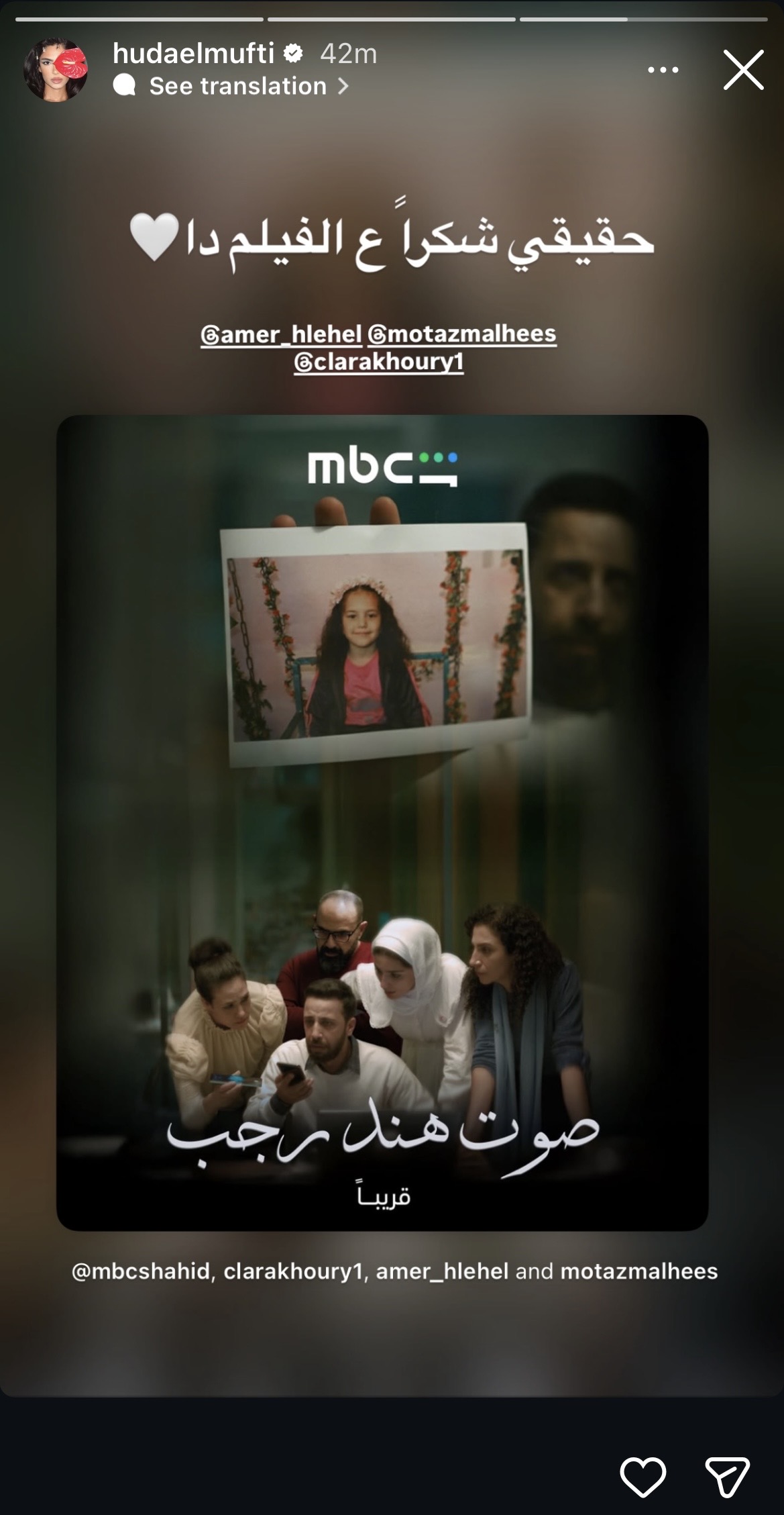 أشادت الفنانة هدى المفتي، بفيلم “صوت هند رجب” في أحدث ظهور عبر حسابها الرسمي على انستجرام.