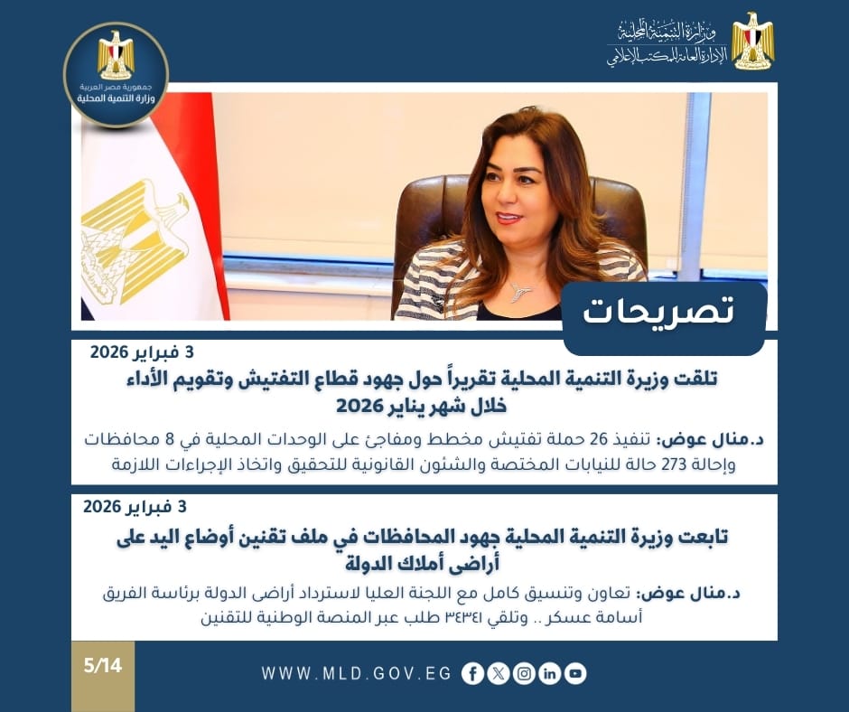 تلقت الدكتورة منال عوض وزيرة التنمية المحلية والقائم بأعمال وزير البيئة، تقريراً حول جهود قطاع التفتيش و تقويم الأداء والمتابعة خلال شهر يناير 2026، حيث أشارت وزيرة التنمية المحلية إلى أن القطاع قام بعدد (26) حملة تفتيش (مخطط /مفاجئ/فحص شكاوي) على عدد (8) محافظات هي (القاهرة، الجيزة، القليوبية ، الشرقية ، البحر الأحمر، قنا ، سوهاج ، والإسماعيلية )، أسفرت تلك الجهود عن إحالة عدد (273) حالة للنيابات المختصة ( النيابة العامة والنيابة الإدارية) والشئون القانونية لاتخاذ الإجراءات اللازمة حيال المخالفات.