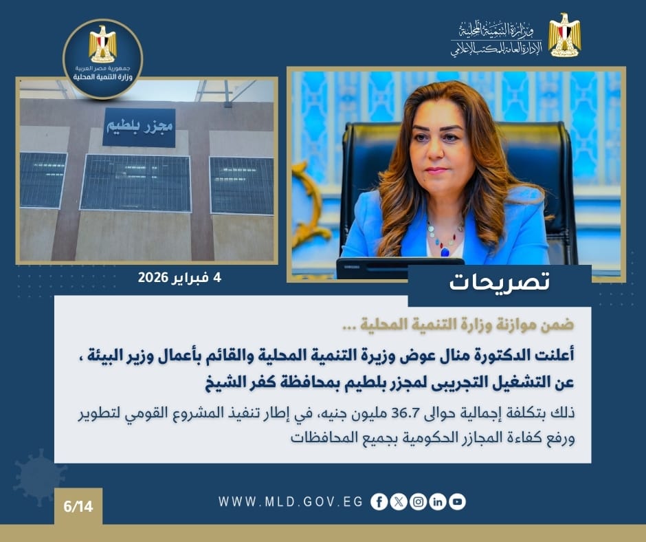 أعلنت الدكتورة منال عوض وزيرة التنمية المحلية والقائم بأعمال وزير البيئة ، عن التشغيل التجريبى لمجزر بلطيم بمحافظة كفر الشيخ وذلك بتكلفة إجمالية حوالى 36.7 مليون جنيه ضمن موازنة وزارة التنمية المحلية لتنفيذ المشروع القومي لتطوير ورفع كفاءة المجازر الحكومية بجميع المحافظات.