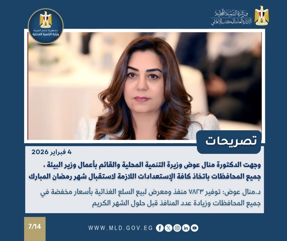 ووجهت الدكتورة منال عوض وزيرة التنمية المحلية والقائم بأعمال وزير البيئة، جميع المحافظات باتخاذ كافة الاستعدادات اللازمة لاستقبال شهر رمضان المبارك، مشيرًة إلى أهمية التأكيد على توفير الحصص التموينية والبترولية والمحروقات يوميا لتلبية احتياجات المواطنين، مع قيام مديريات التموين بحملات يومية على المحلات والمطاعم والأسواق للتأكد من صلاحية المنتجات المعروضة، وضبط أية مخالفات، والإشراف على المخابز للتأكد من وفرة الخبز المدعم للمواطنين، وذلك بالتنسيق مع كافة الجهات المعنية.