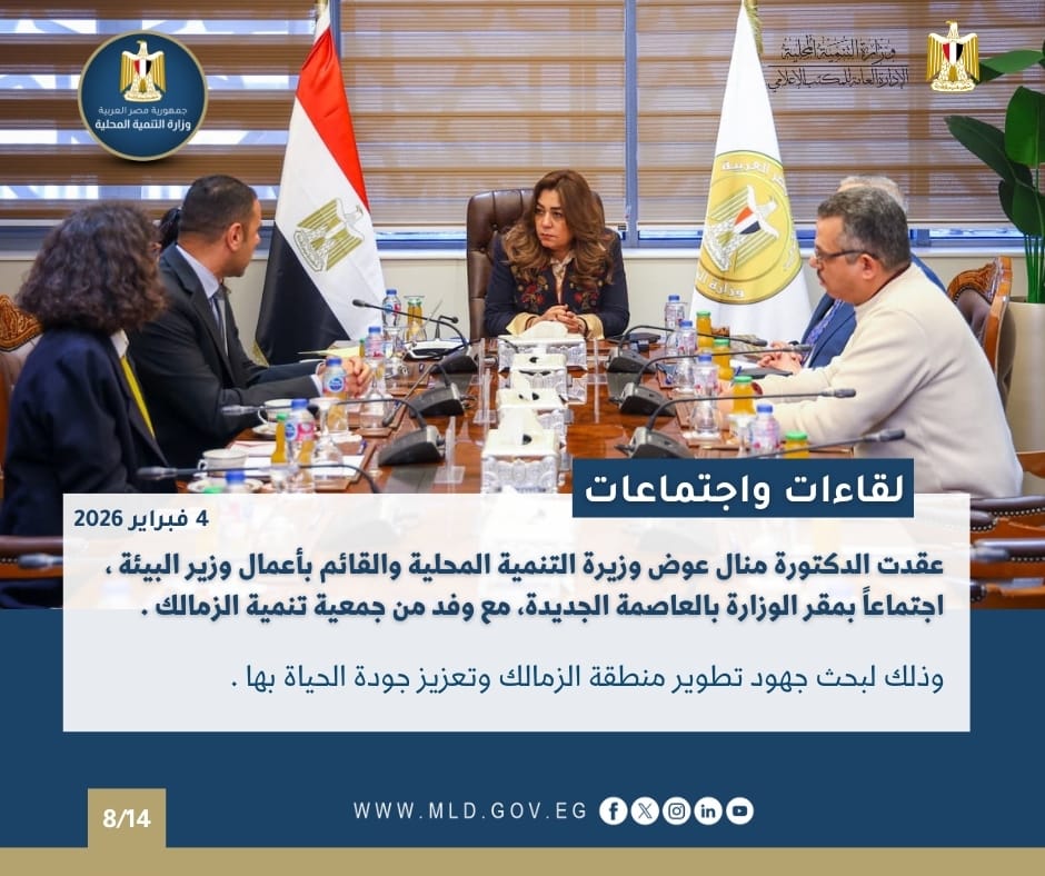 كما عقدت الدكتورة منال عوض وزيرة التنمية المحلية والقائم بأعمال وزير البيئة ، اجتماعاً اليوم مع وفد من جمعية تنمية الزمالك برئاسة نادرة زكي، وذلك لبحث جهود تطوير منطقة الزمالك وتعزيز جودة الحياة بها.