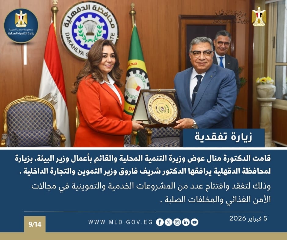 قامت الدكتورة منال عوض وزيرة التنمية المحلية والقائم بأعمال وزير البيئة ، بزيارة لمحافظة الدقهلية يرافقها الدكتور شريف فاروق وزير التموين والتجارة الداخلية لتفقد وافتتاح عدد من المشروعات الخدمية والتموينية في مجالات الأمن الغذائي والمخلفات الصلبة،