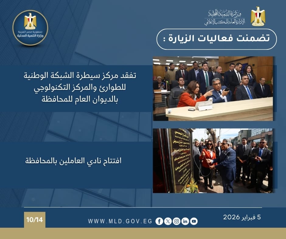 أصدر المركز الإعلامي لوزارة التنمية المحلية "الانفوجراف الأسبوعي" في نسخته الـ 174 حول أبرز أنشطة وفعاليات الوزارة بقيادة الدكتورة منال عوض وزيرة التنمية المحلية والقائم بأعمال وزير البيئة، حيث تضمن مجموعة من الفعاليات والاجتماعات ومتابعة المشروعات التنموية المهمة خلال الفترة (30 يناير : 5 فبراير 2026).