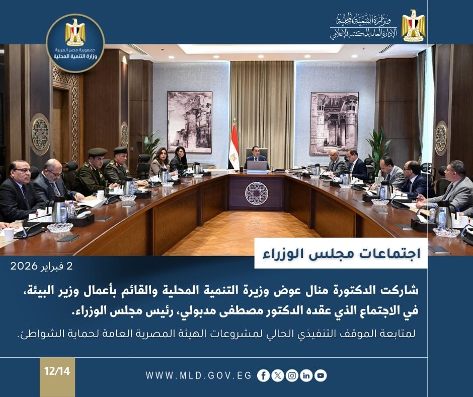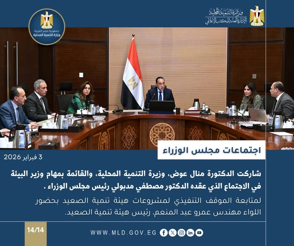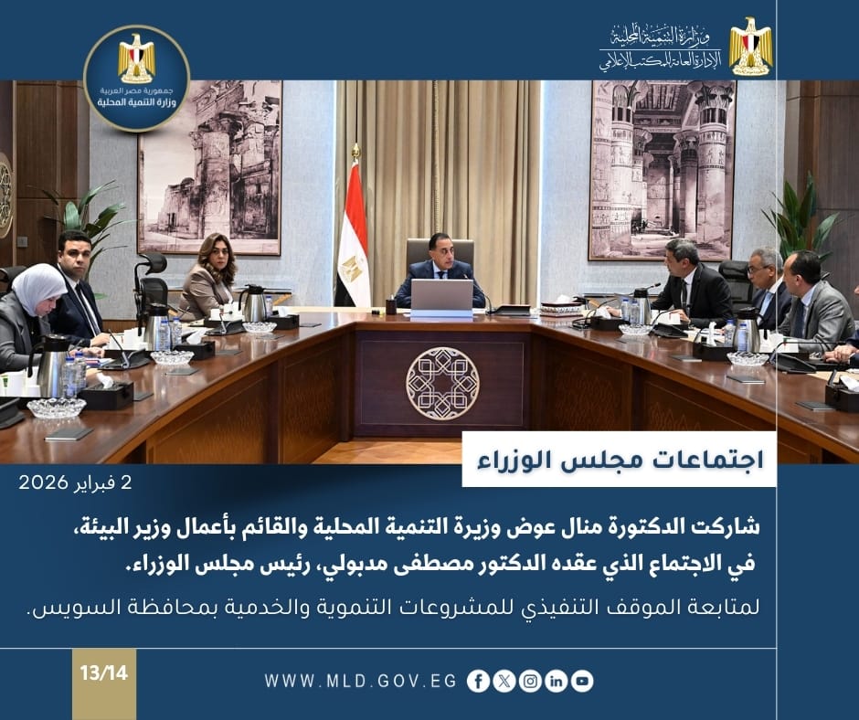 كما شاركت الدكتورة منال عوض وزيرة التنمية المحلية والقائم بأعمال وزير البيئة، في الاجتماع الذي عقده الدكتور مصطفى مدبولي، رئيس مجلس الوزراء؛ لمتابعة الموقف التنفيذي للمشروعات التنموية والخدمية بمحافظة السويس.
