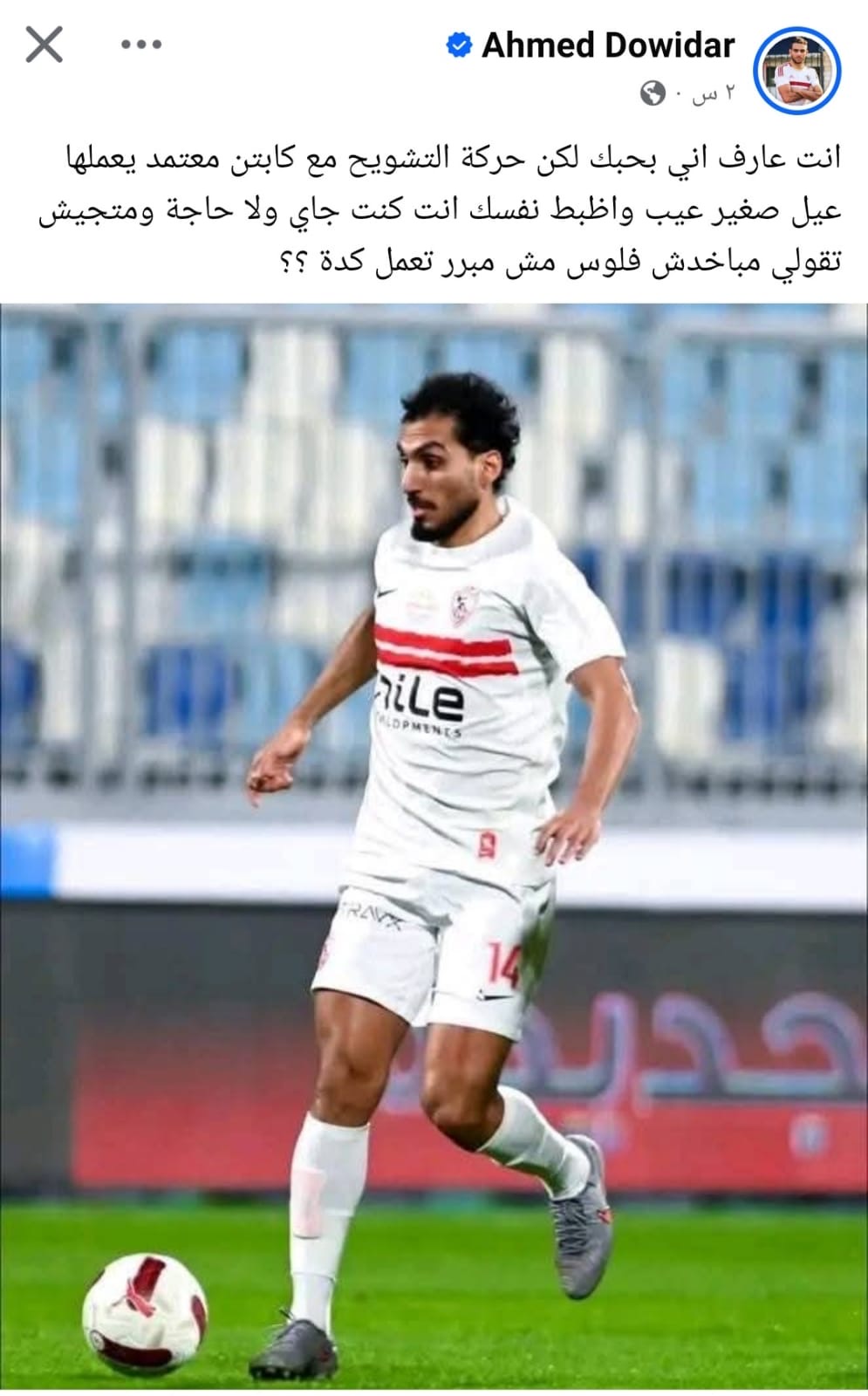وكتب دويدار عبر حسابه علي فيسبوك "إنت عارف إني بحبك لكن حركة التشويح مع كابتن معتمد يعملها عيل صغير عيب واظبط نفسك انت كنت جاي ولا حاجة ومتجيش تقولي مباخدش فلوس مش مبرر تعمل كدة ؟؟"