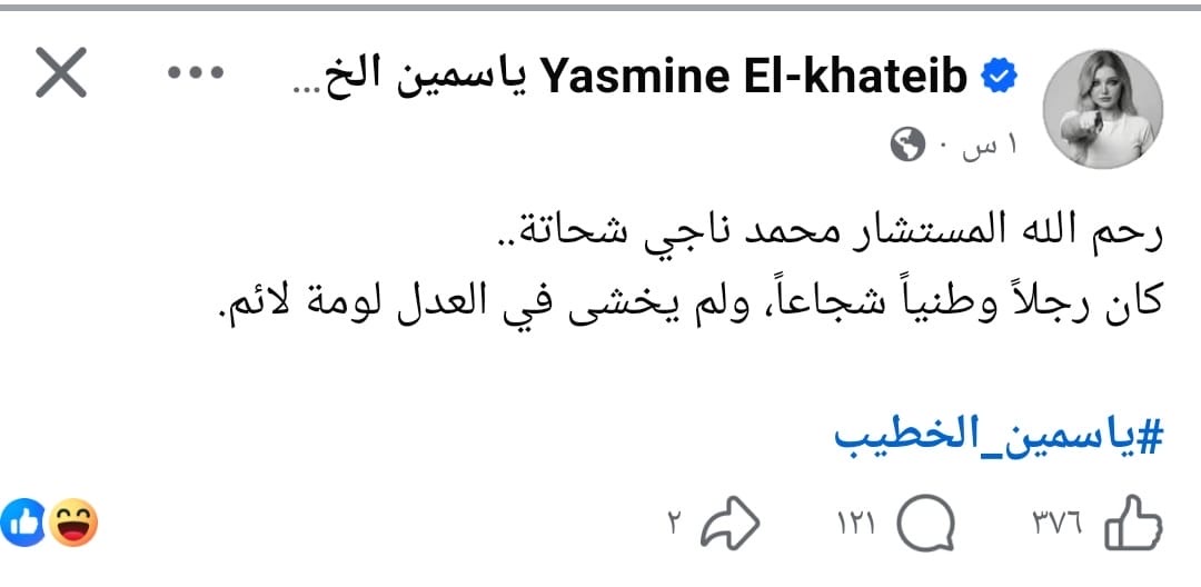 وكتبت ياسمين الخطيب عبر حسابها علي فيسبوك "رحم الله المستشار محمد ناجي شحاتة..