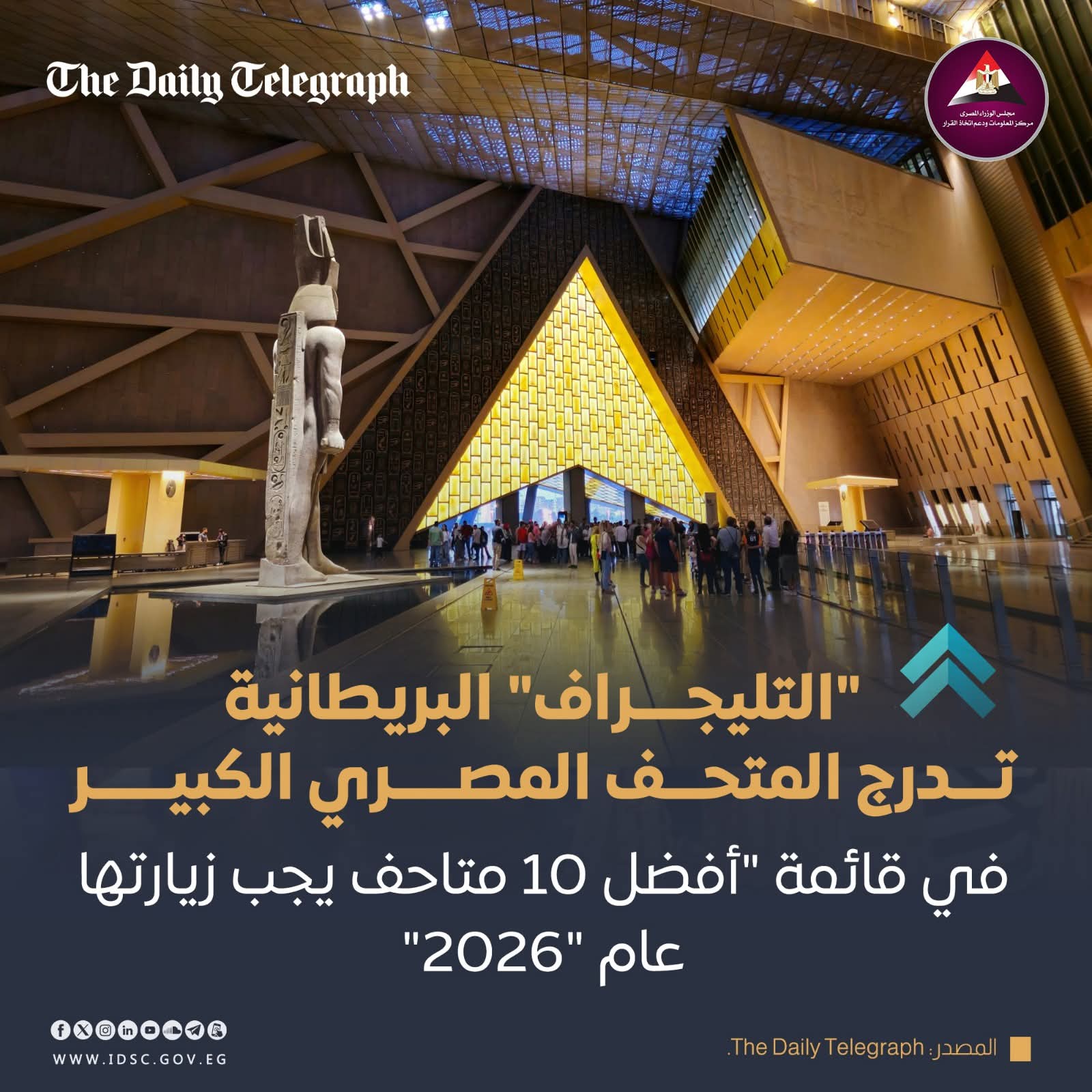 نشر مركز المعلومات ودعم اتخاذ القرار بمجلس الوزراء “انفوجراف” عبر صفحته الرسمية على موقع التواصل الاجتماعي فيس بوك بشأن تقرير صحيفة تليجراف البريطانية حول المتحف المصري الكبير.