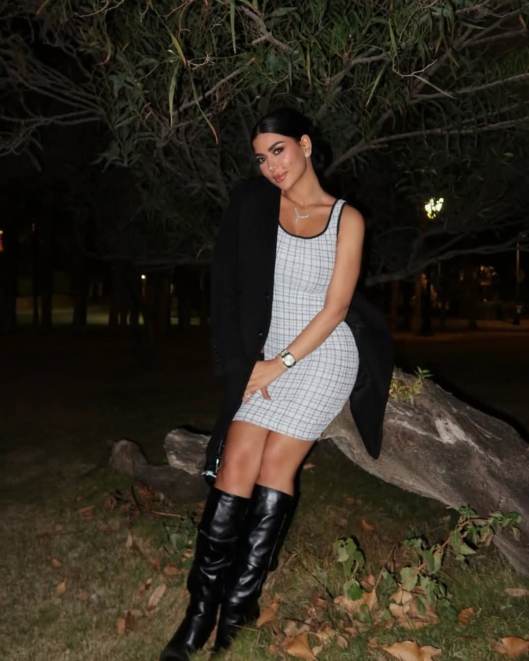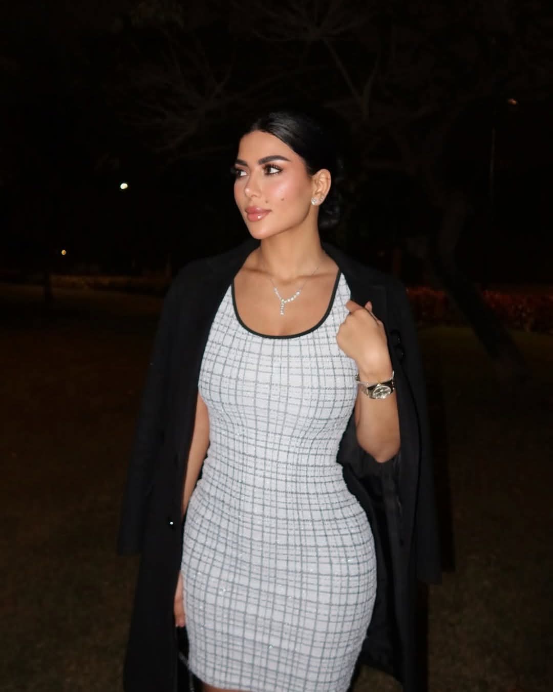 تألقت كارولين عزمي في الصور بإطلالة أنثوية ملفتة، حيث ارتدت فستان قصير ذا أكمام مكشوفة واتسم التصميم بالقماش الكاروهات الذي جمع بين اللون الأبيض و الأسود.