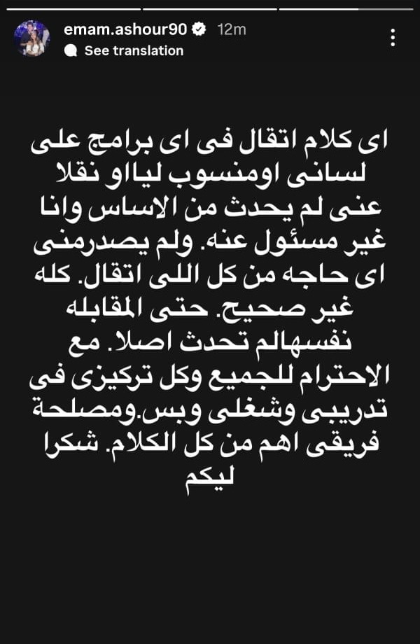 واختتم إمام عاشور: “حتى المقابله نفسها لم تحدث اصلا مع الاحترام للجميع وكل تركيزى في تدريبى وشغلى وبس ومصلحة فريقى اهم من كل الكلام شكرا ليكم”.