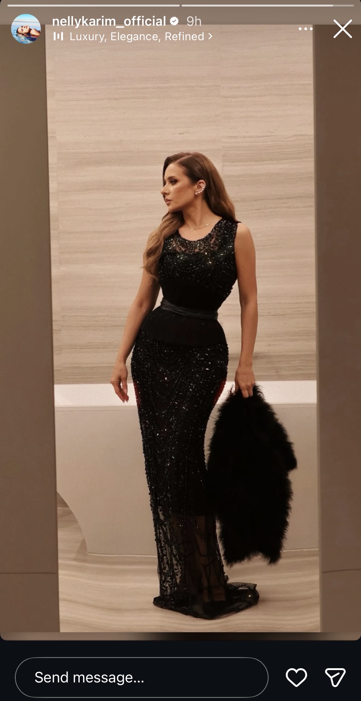 وظهرت نيللي بإطلالة كلاسيكية أنيقة، بفستان أسود طويل يبرز جمالها ورشاقتها.