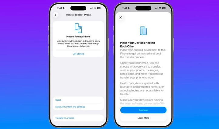 - ميزة نقل من آيفون إلى أندرويد : تتيح هذه الأداة للمستخدمين نقل البيانات بين آيفون وجهاز أندرويد، بما في ذلك الصور، الرسائل، الملاحظات، التطبيقات، وحتى رقم الهاتف، بشكل لاسلكي، يمكن الوصول إلى الميزة عبر: الإعدادات > عام > نقل أو إعادة ضبط آيفون > النقل إلى أندرويد.
