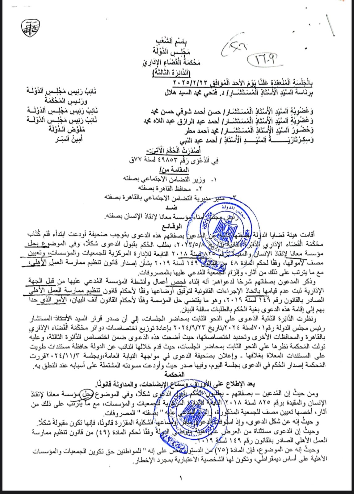 وتكشف حيثيات الحكم القضائى، الذي أصدرته محكمة القضاء الإداري، في فبراير 2025، فى الدعوى رقم 49853، المقامة من وزير التضامن الاجتماعى بصفته، ومحافظ القاهرة بصفته، ومدير مديرية التضامن الاجتماعي بصفته، ضد رئيس مجلس أمناء مؤسسة «معانا لإنقاذ إنسان» بصفته، عن غلق المؤسسة وحلها، لعدم اتخاذها الإجراءات القانونية اللازمة لتوفيق أوضاعها وفقًا لأحكام قانون تنظيم ممارسة العمل الأهلى رقم 149 لسنة 2019.