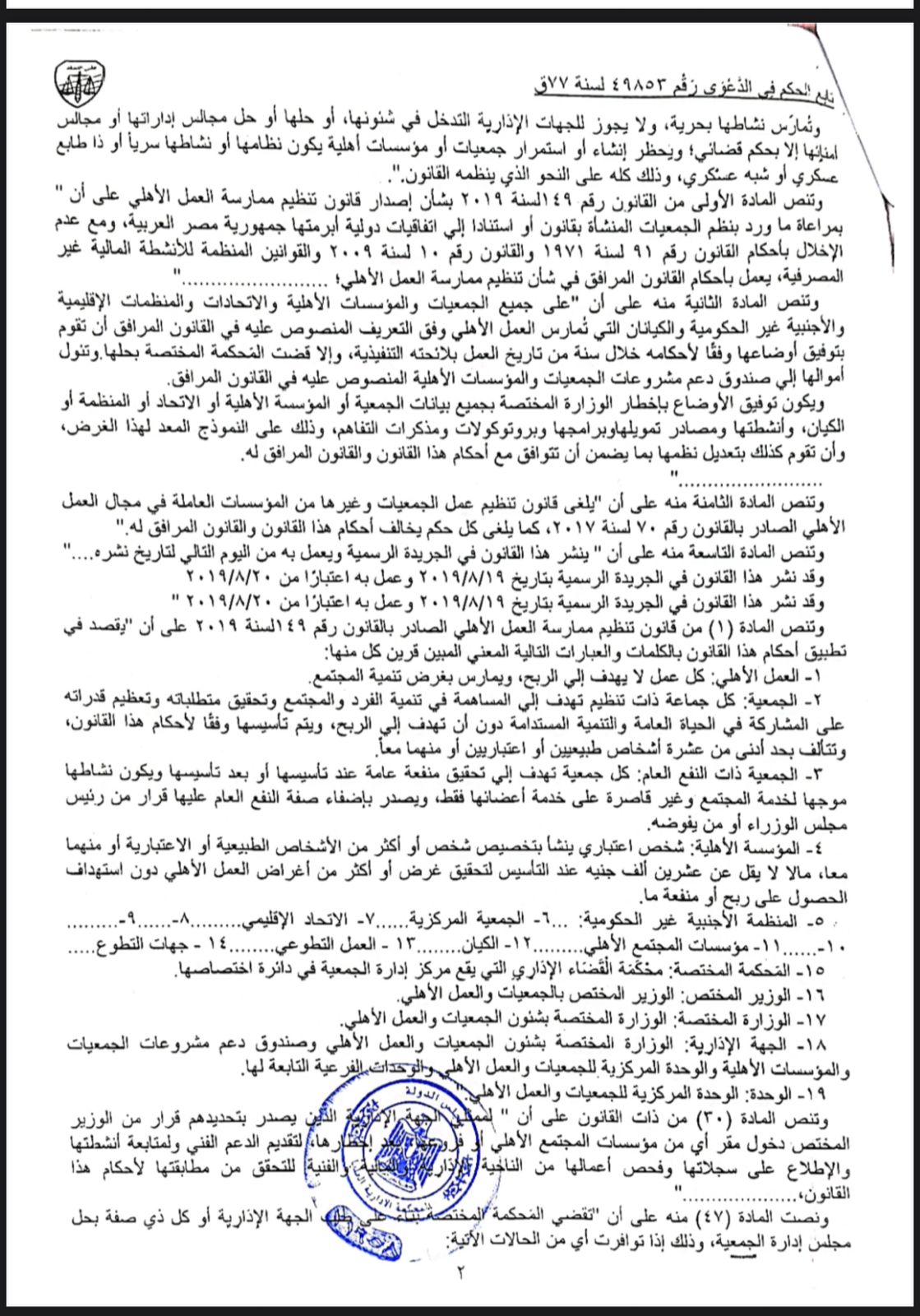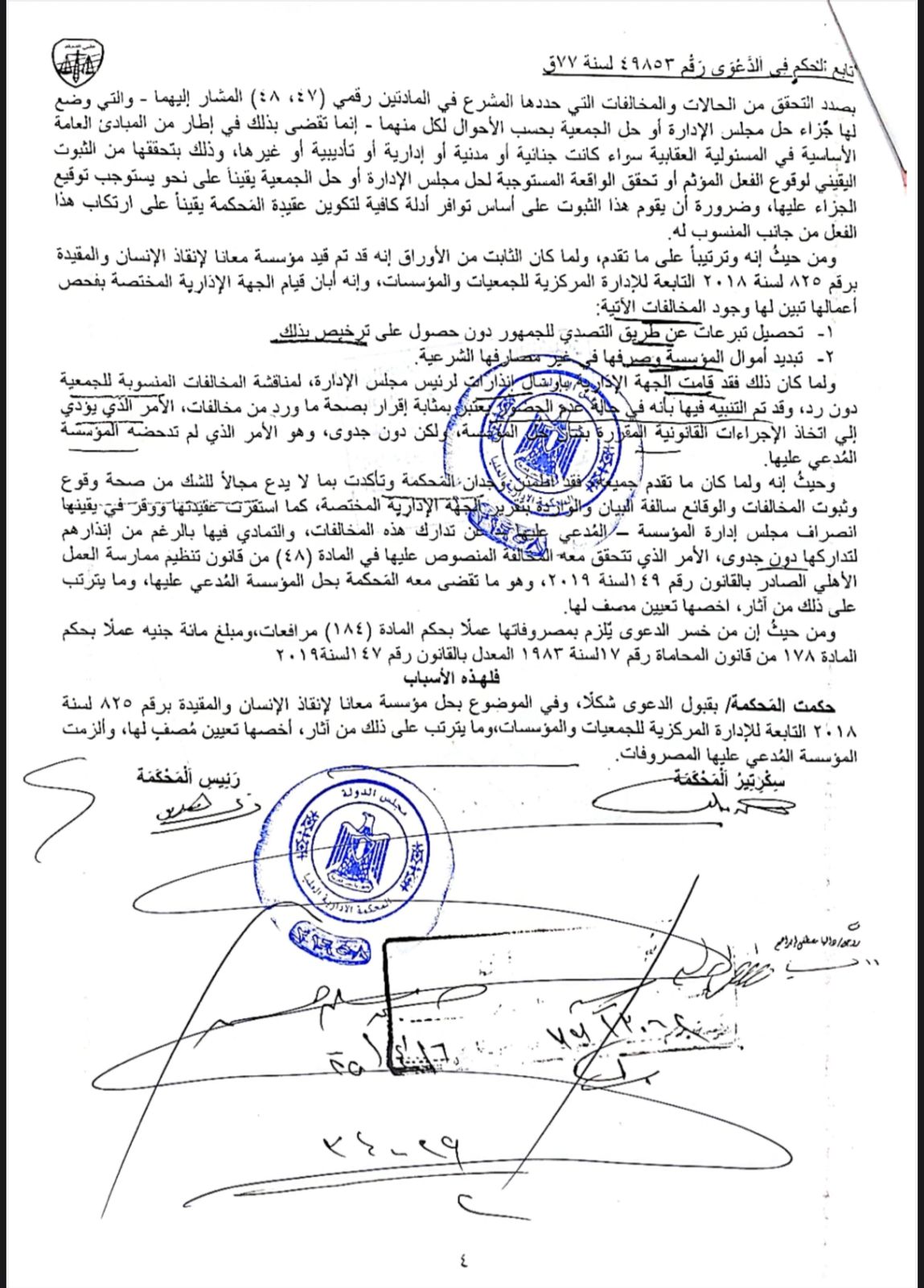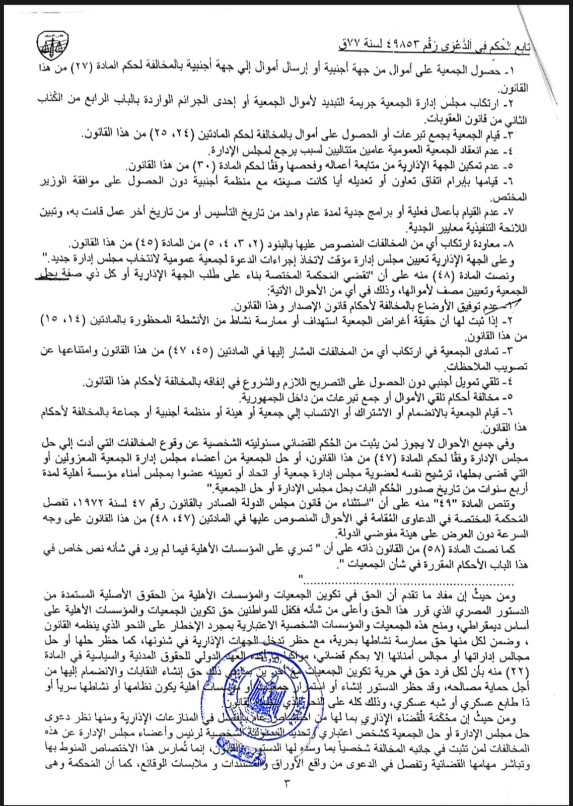 ووفقًا للمستندات أيضًا، فقد اطمئن وجدان المحكمة وتأكدت بما لا يدع مجالًا للشك من صحة وقوع وثبوت المخالفات والوقائع سالفة البيان، كما استقرت عقيدتها ووقر في يقينها انصراف مجلس إدارة المؤسسة - المدعي عليها بدا من تدارك هذه المخالفات، والتمادي فيها بالرغم من إنذارهم لتداركها دون جدوى، الأمر الذي تتحقق معه المخالفة المنصوص عليها في المادة (48) من قانون تنظيم ممارسة العمل الأهلي الصادر بالقانون رقم 49 السنة 2019، وهو ما تقضى معه المحكمة بحل المؤسسة المدعي عليها، وما يترتب على ذلك من آثار.