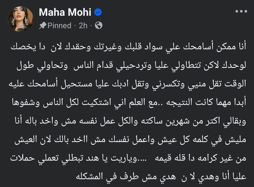 وقالت مها نصار : أنا ممكن أسامحك علي سواد قلبك، وغيرتك وحقدك لأن دا يخصك لوحدك، لكن تتطاول عليا وتردحيلي قدام الناس وتحاولي طول الوقت تقل مني وتكسرني وتقل أدبك عليا مستحيل أسامحك عليه أبدًا مهما كانت النتيجة.