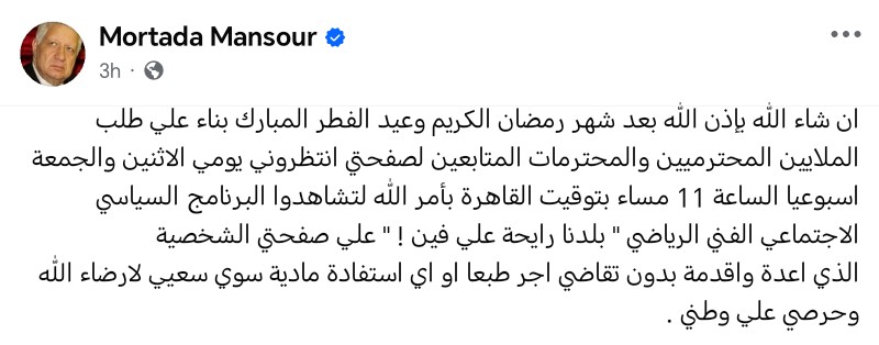 وكتب مرتضي منصور عبر صفحته على موقع التواصل الاجتماعي فيسبوك:"ان شاء الله بإذن الله بعد شهر رمضان الكريم وعيد الفطر المبارك بناء علي طلب الملايين المحترميين والمحترمات المتابعين لصفحتي انتظروني يومي الاثنين والجمعة أسبوعيا الساعة 11 مساء بتوقيت القاهرة بأمر الله لتشاهدوا البرنامج السياسي الاجتماعي الفني الرياضي " بلدنا رايحة علي فين ! " علي صفحتي الشخصية