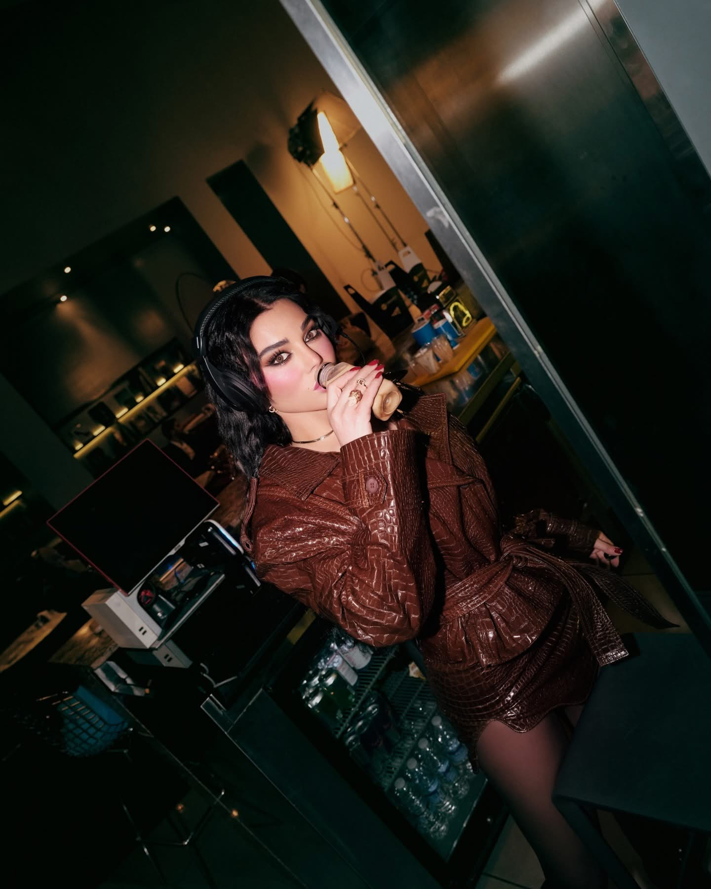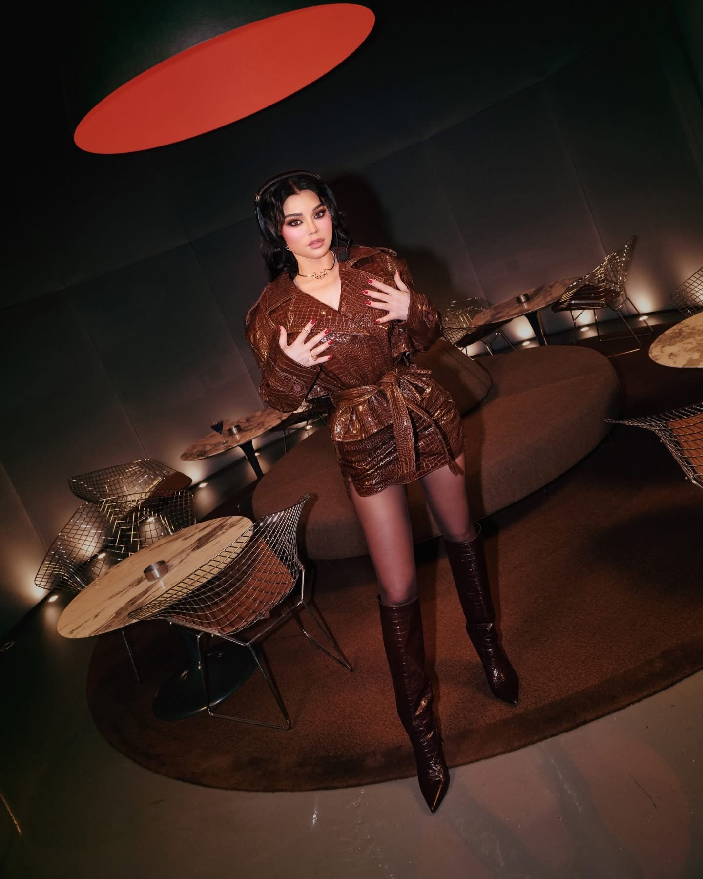 وحضرت هيفاء وهبي عرض أزياء دار جورج شقرا وهي ترتدي فستانا من تصميمه لمجموعته لخريف 2025، جاء باللون البني من خامة تشبه الشبك مبطنة لأعلى الركبة مع Cape طويل من خامة لامعة.