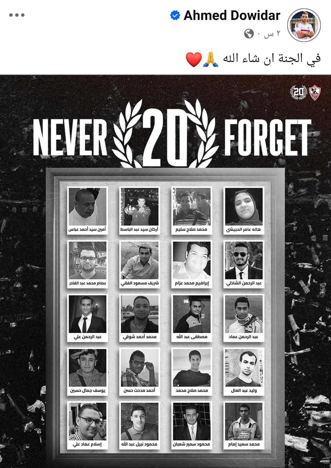 ونشر دويدار صورة عبر الرسمي على موقع التواصل الاجتماعي "فيسبوك" لافتة لجماهير النادي مكتوب عليها "في الجنة ان شاء الله ".
