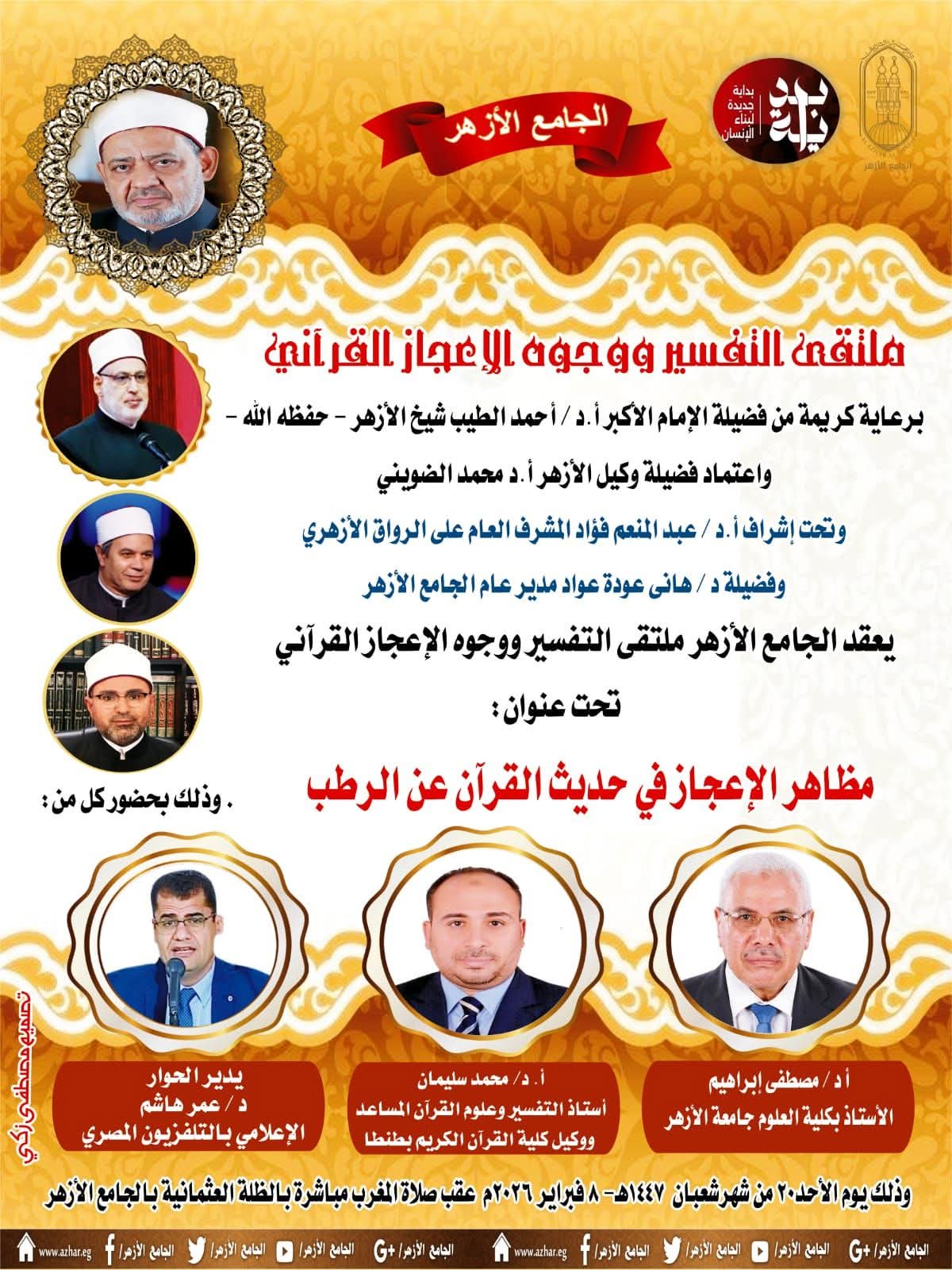 يواصل ملتقى التفسير بالجامع الأزهر اليوم لقاء التفسير الأسبوعي بعنوان "مظاهر الإعجاز في حديث القرآن عن خلق الرُطَب" وذلك بحضور كل من: أ.د مصطفى إبراهيم، الأستاذ بكلية العلوم جامعة الأزهر، وأ. محمد سليمان، أستاذ التفسير وعلوم القرآن المساعد ووكيل كلية القرآن الكريم بطنطا، ويدير الحوار د. عمر هاشم الإعلامي بالتليفزيون المصري.