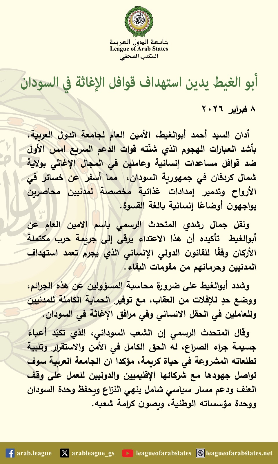 وقال المتحدث الرسمي، إن الشعب السوداني، الذي تكبد أعباء جسيمة جراء الصراع، له الحق الكامل في الأمن والاستقرار وتلبية تطلعاته المشروعة في حياة كريمة، مؤكداً أن الجامعة العربية سوف تواصل جهودها مع شركائها الإقليميين والدوليين للعمل على وقف العنف ودعم مسار سياسي شامل ينهي النزاع ويحفظ وحدة السودان ووحدة مؤسساته الوطنية، ويصون كرامة شعبه.