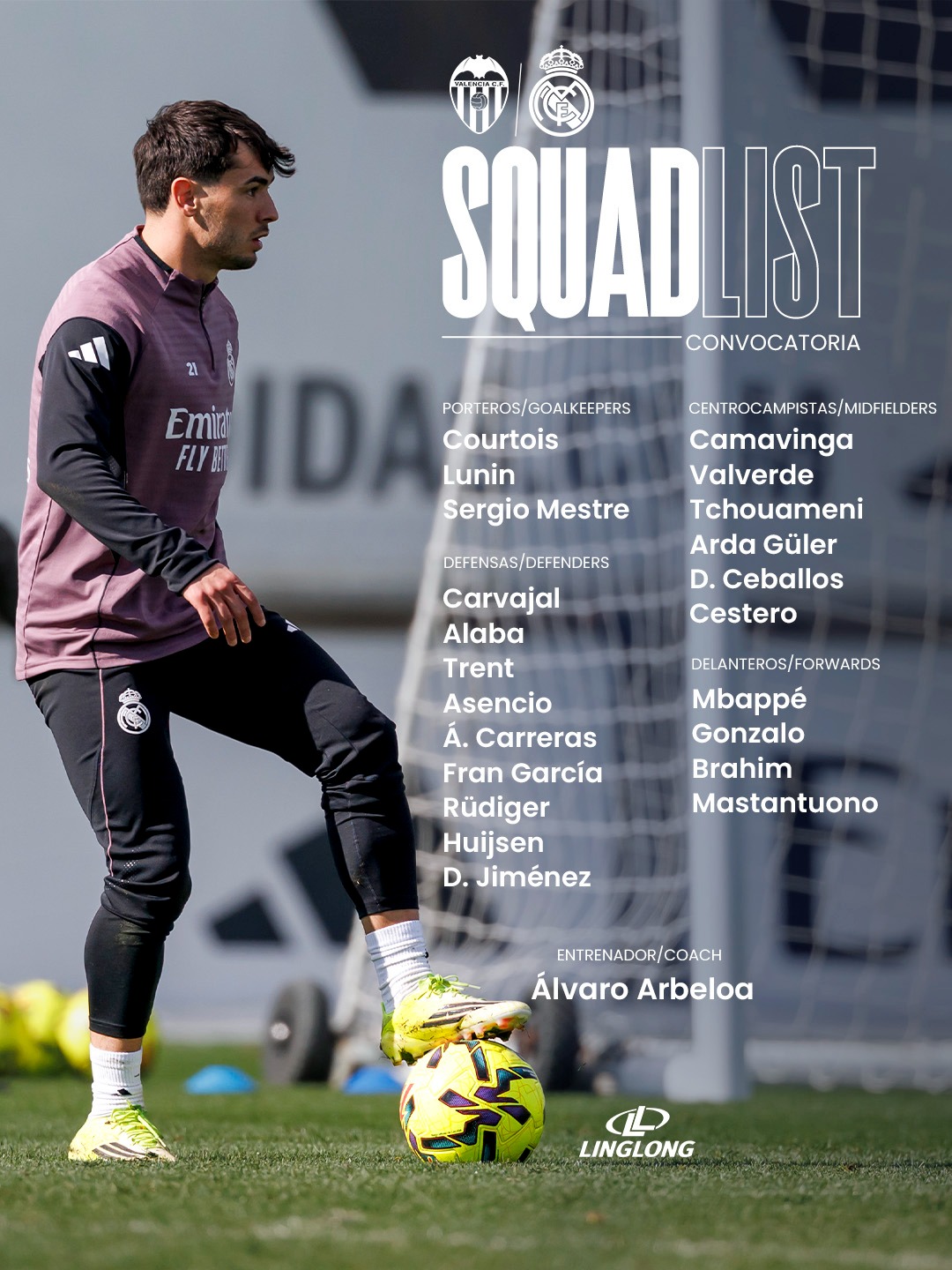 أعلن المدير الفني لنادي ريال مدريد، ألفارو أربيلوا، عن قائمة الفريق لمواجهة فالنسيا، اليوم الأحد، ضمن منافسات الجولة الثالثة والعشرين من الدوري الإسباني، على ملعب "الميستايا".