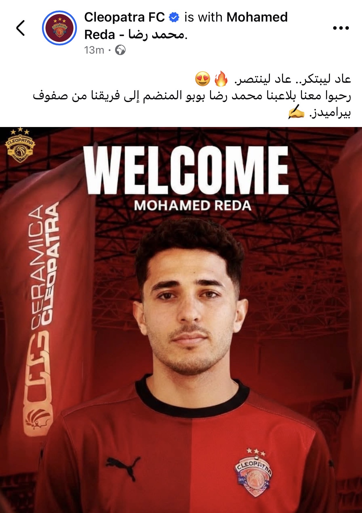 أعلن نادي سيراميكا كليوباترا عن التعاقد مع اللاعب محمد رضا بوبو قادمًا من صفوف نادي بيراميدز، وذلك في إطار تدعيم صفوف الفريق خلال الفترة الحالية.