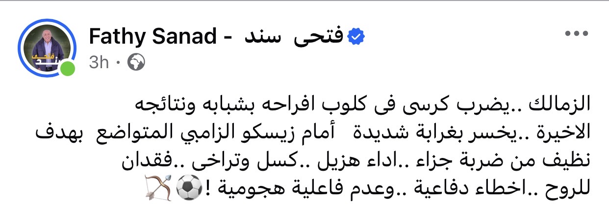 وكتب فتحى سند عبر حسابه علي فيسبوك "الزمالك ..يضرب كرسى فى كلوب أفراحه بشبابه ونتائجه الأخيرة ..يخسر بغرابة شديدة أمام زيسكو الزامبي المتواضع بهدف نظيف من ضربة جزاء .. أداء هزيل ..كسل وتراخى ..فقدان للروح ..أخطاء دفاعية ..وعدم فاعلية هجومية !"