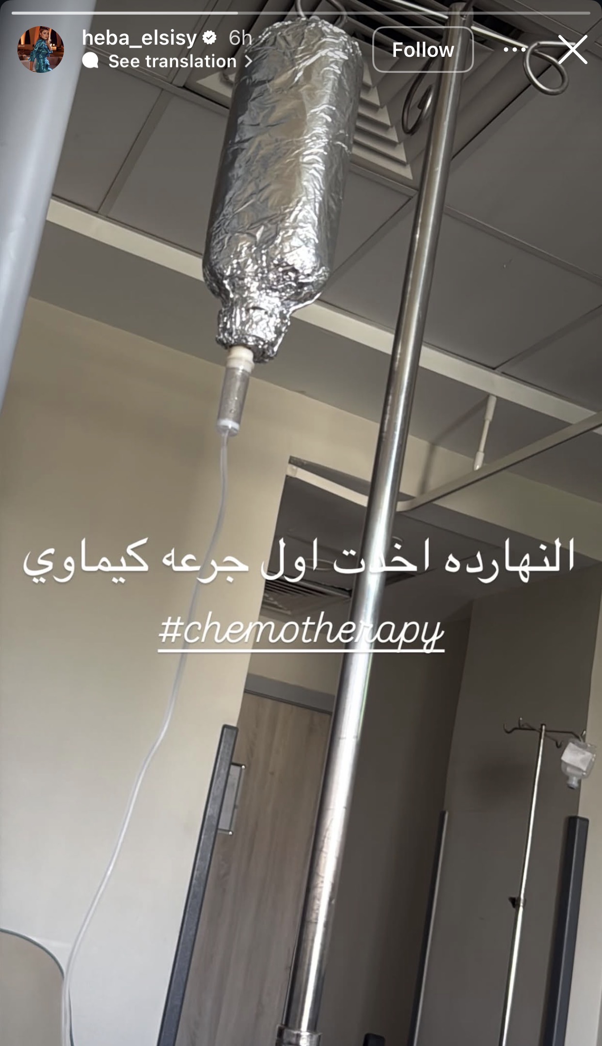 ونشرت هبة السيسي عبر خاصية «الاستوري» على حسابها الرسمي بموقع إنستجرام صورة لها من داخل المستشفى أثناء تلقي العلاج، وعلّقت عليها موضحة أنها تلقت أول جرعة كيماوي.