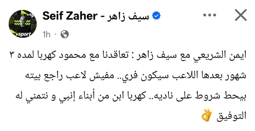 وقال «الشريعي» في تصريحات تليفزيونية، عبر قناة «أون سبورت مع سيف زاهر : تعاقدنا مع محمود كهربا لمده ٣ شهور بعدها اللاعب سيكون فري، ومفيش لاعب راجع بيته بيحط شروط على ناديه.