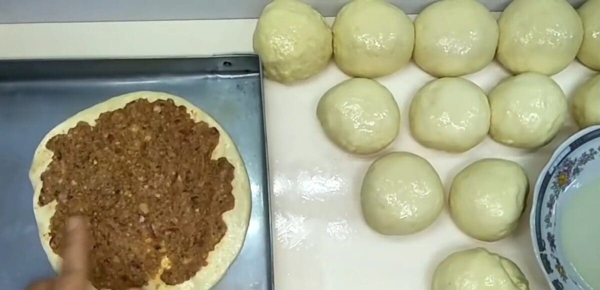 - في وعاء عميق، يُخلط اللحم المفروم مع البصل والتوابل جيدًا.