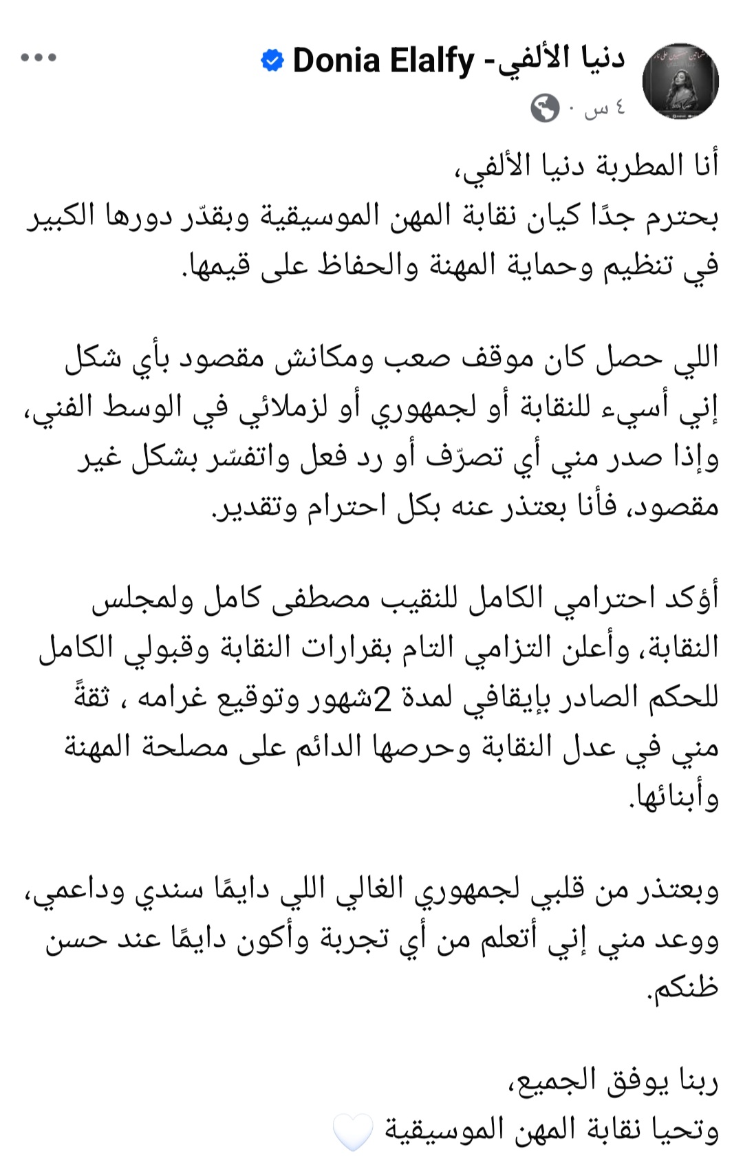 وقالت دنيا الألفي : أنا المطربة دنيا الألفي، بحترم جدًا كيان نقابة المهن الموسيقية وبقدّر دورها الكبير في تنظيم وحماية المهنة والحفاظ على قيمها.
