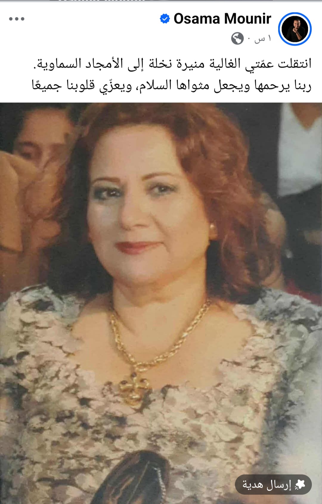 نشر الإعلامي أسامة منير تعليقا عبر صفحته على موقع التواصل الاجتماعي فيسبوك يعلن فيه رحيل عمته.