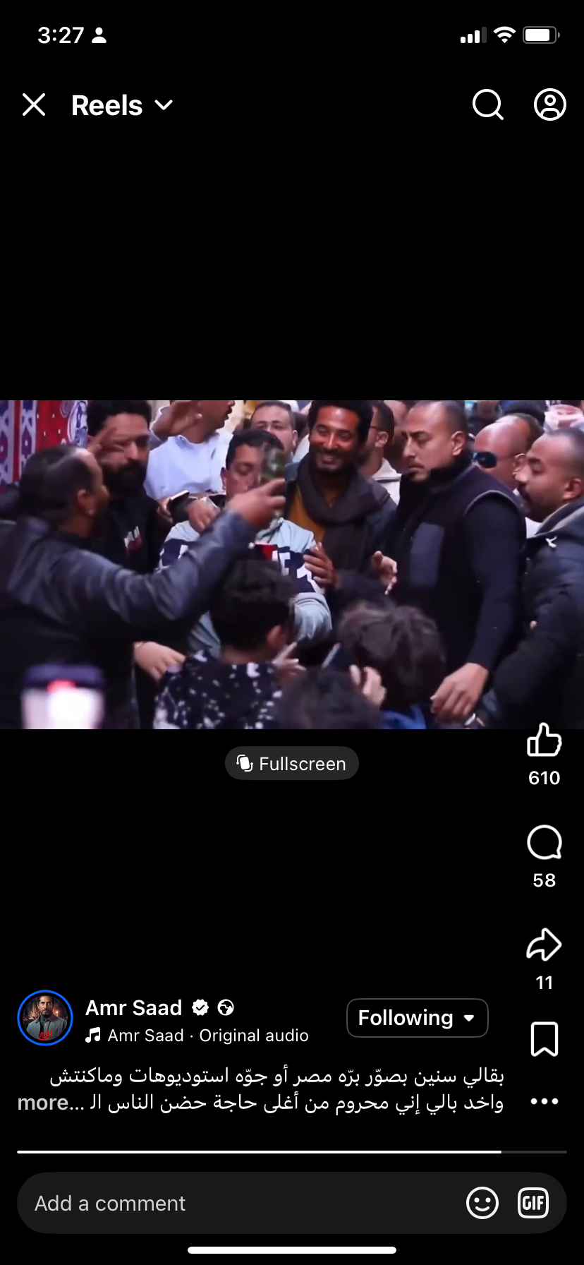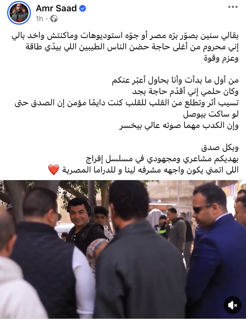 وقال عمرو سعد عبر الفيديو عبر حسابه الشخصي : "بقالي سنين بصوّر برّه مصر أو جوّه استوديوهات وماكنتش واخد بالي إني محروم من أغلى حاجة حضن الناس الطيبين اللي بيدّي طاقة وعزم وقوة، من أول ما بدأت وأنا بحاول أعبّر عنكم، وكان حلمي إني أقدّم حاجة بجد تسيب أثر وتطلع من القلب للقلب".