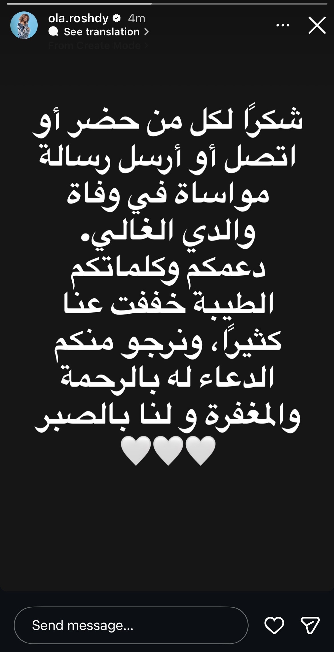 وكتبت علا رشدي عبر ستوري حسابها على انستجرام: “شكرا لكل من حضر أو اتصل أو ارسل رسالة مواساة في وفاة والدي الغالي دعمكم وكلماتكم الطيبة خففت عنا كثيرا ونرجو منكم الدعاء له بالرحمة والمغفرة ولنا بالصبر”.