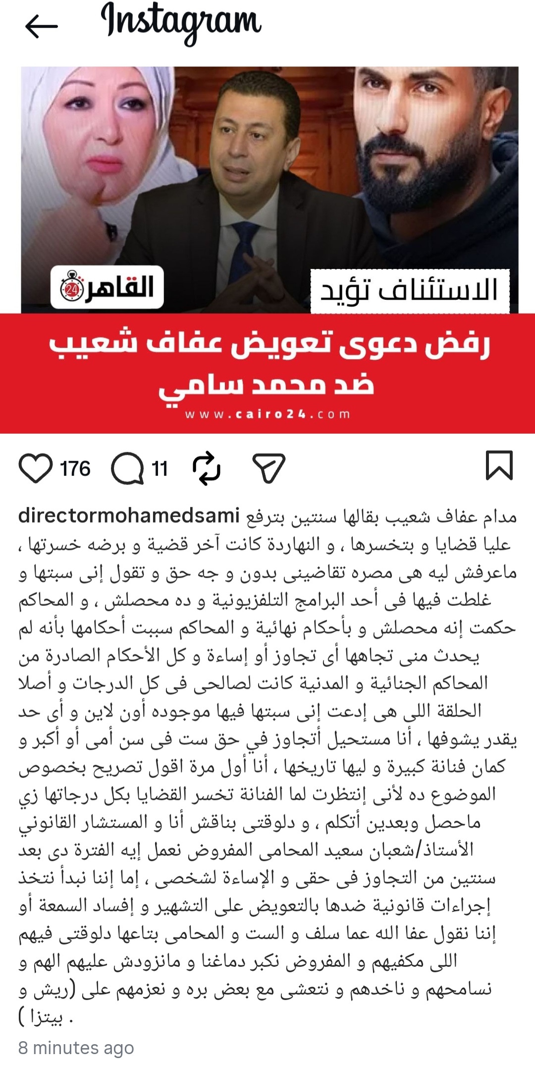 و كتب محمد سامي عبر انستجرام:مدام عفاف شعيب بقالها سنتين بترفع عليا قضايا وبتخسرها ، و النهاردة كانت آخر قضية وبرضه خسرتها ، ما عرفش ليه هي مصره تقاضینی بدون و جه حق و تقول إني سبتها و غلطت فيها في أحد البرامج التلفزيونية و ده محصلش ، و المحاكم حکمت إنه محصلش و بأحكام نهائية والمحاكم سببت أحكامها بأنه لم يحدث منى تجاهها أي تجاوز أو إساءة و كل الأحكام الصادرة من المحاكم الجنائية والمدنية كانت لصالحى فى كل الدرجات.